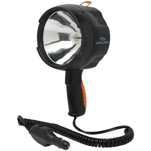 1,400 lumens; 1,476 ft. long-range beam distance; Direct use with 12-volt DC plug adapter; Heavy-gauge, coiled cord extends up to 10 ft.; Aluminum reflector with tempered glass colored lens; On/off sliding switch; Durable ABS plastic housing; Retractable metal hanging bracket; Contoured rubberized grip; High-intensity, 100 watt halogen bulb; Includes manual;