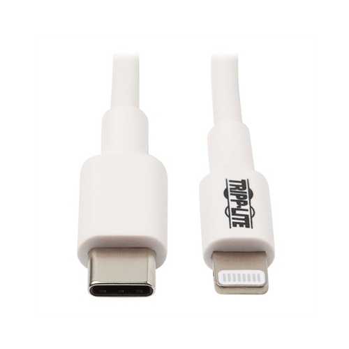 Tripp Lites 3 ft. USB-C Cable Charges and Syncs Your Latest-Generation iPhone iPad and iPod This USB-C sync/charge cable (M/M) connects your iPhone iPad or iPod to the USB-C port on a computer MacBook Chromebook Ultrabook car charger or wall charger. It allows you to charge and power your Apple device while simultaneously synching and transferring data at USB 2.0 data transfer speeds up to 480 Mbps. The cable is backward compatible with previous USB generations allowing you to use it with older equipment. MFi-Certified for Broad Device Compatibility The 20V 3A (60W) Lightning cable is MFi-certified for use with the latest generation of iPhone iPad and iPod devices. It's compatible with iPhone (5 5c 5s 6 6 Plus 6s 6s Plus SE 7 7 Plus 8 8 Plus X XR XS XS Max) iPad (4th 5th and 6th generations) iPad mini iPad mini 2 iPad mini 3 iPad mini 4 iPad Air iPad Air 2 iPod Touch (5th and 6th generations) iPad Pro 12.9 inch (1st and 2nd generations) iPad Pro 10.5 inch and iPad Pro 9.7 inch. Reversible Lightning and USB Type-C Plugs Connect in Either Direction Connect the reversible 8-pin Lightning plug to your Apple device for charging and synchronizing and the reversible USB-C connector to a USB-C port on a computer or charger. The fumble-free plugs connect in either direction to ensure fast easy connection every time. The three-foot length helps reduce cable clutter and the cable is short enough to be conveniently carried in your car bag or briefcase for instant charging. Integral strain relief gives the cable extra flexibility reduces stress and helps the cable move freely without cracking or breaking loose from the connectors.