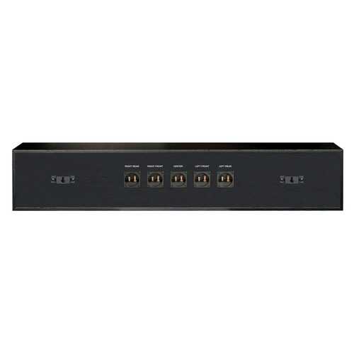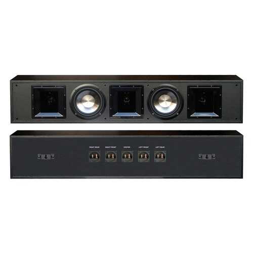 Patented 3 or 5 discrete channel sound bar system; Plays true 5-channel theater sound; Three 6-1/2 in. mid/high frequency horn tweeters with neodymium magnets deliver highs beyond audible range and extremely accurate mid frequencies.; Two 6-1/2 in. injection-molded woofers with butyl-rubber surrounds enable extended bass output down to 37 Hz; Two 4-1/4 in. side-mounted surrounds for true rear channel effects. ; Up to 125 watts RMS per channel, 625 watt system; Frequency response: 37 Hz to 23 kHz; Sensitivity: 96 dB @ 1 watt/1 meter; high efficiency output to 116 dB (live rock band levels); Impedance: 8 ohms; Gold-plated binding posts; Dimensions: 8 in. H x 43 in. W x 7 in. D; Requires a multichannel audio receiver for hookup; Weight: 35 lbs.; Black wood-grain finish; Includes flush wall mounts for easy installation; 5-year warranty;