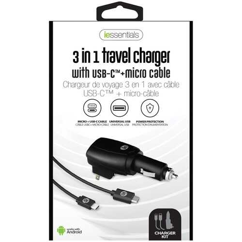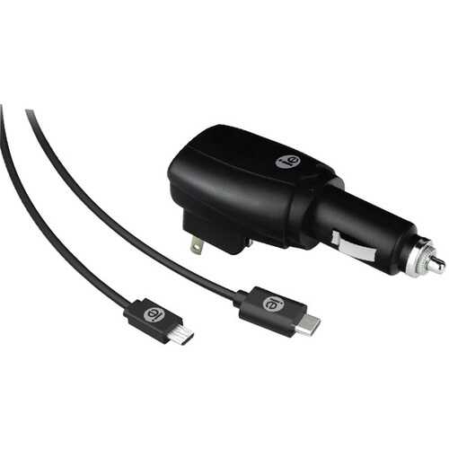 Car & wall charger; Features additional USB port; Fits any DC outlet; Fold-out AC prongs work with any AC outlet; Built-in IC chip regulates voltage & prevents overcharging; 1-hour quick charge; Compatible with Android(TM), smartphones & tablets; Includes a 4ft micro USB to USB-A cable & a 4ft USB-A to USB-C(TM) cable;