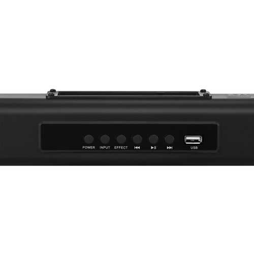 Bluetooth(R) 5.0; 4 x 10 watt 2-channel speaker system; Optical input; FM radio; Coaxial input; USB input; LED display; Includes remote, auxiliary input, wall brackets, auxilairy cable, RCA cable, and 100 to 240-volt AC adapter;