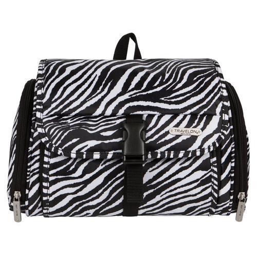 Keep your toiletries neat, organized, and within easy reach while you travel when you pack them in the Travelon Hanging Toiletry Kit. This stylish and compact bag is the perfect way to store and organize all your toiletries. It includes a total of 7 storage areas, with a large main storage compartment that features 4 elastic loops to keep bottles upright, a PVC pocket for things that might spill, 3 additional zippered pockets on the interior, and two more exterior zippered pockets for other odds and ends. Plus, the bag includes a built-in durable hanging hook so you can easily open the bag and hang it flat from a towel rod, hanging hook, door, and more. When you"re all done, simply zip it shut, secure with the buckle closure, and pack away in your suitcase!