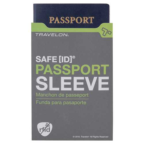 Keep your passport safe from identity thieves with the Safe ID Passport Sleeve from Travelon. Built-in RFID blocking technology protects your cards from scanning the data in your RFID chip passport credit cards, debit cards, etc. Set of 2; each holds a standard sized passport.