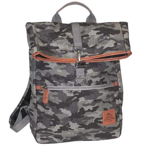 12 oz. Double layered oiled canvas with faux vintage leather trim, square buxton expedition logo patch and buxton expedition signature logo pull expedition ii huntington gear fold-over backpack.