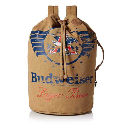 Canvas exterior - distressed faux leather trim, signature Budweiser lining eagle wings drawstring bucket bag features main drawstring opening, side carry handle, padded laptop compartment, interior slip pocket.